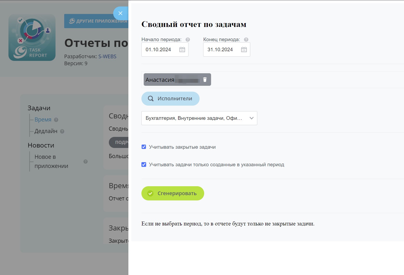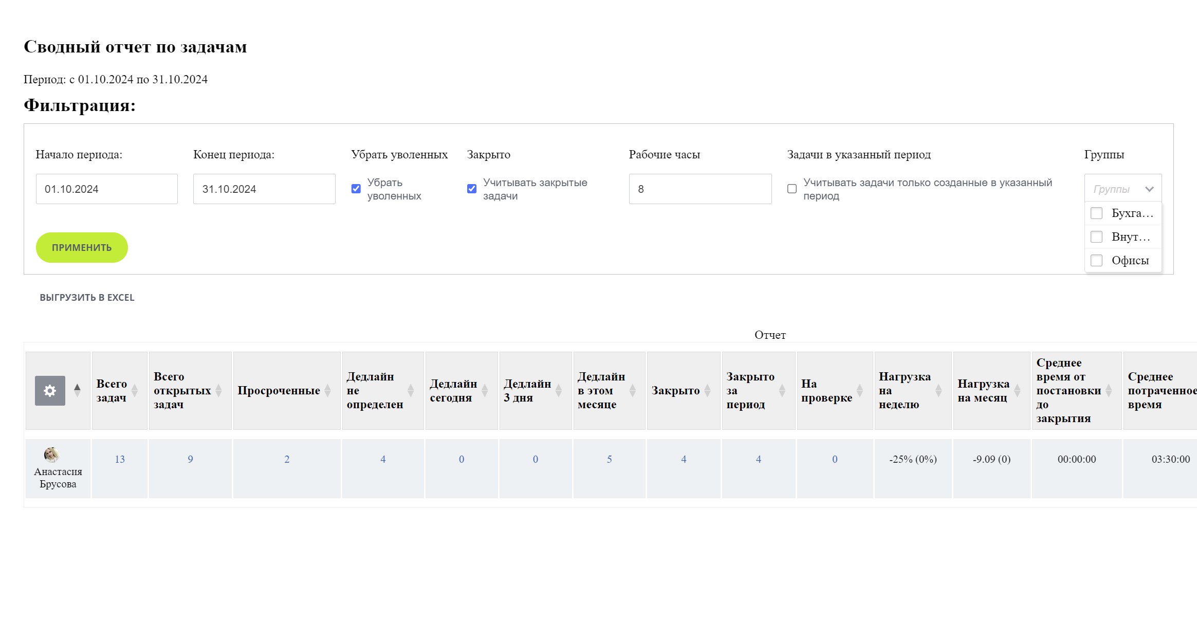 Галочка «Учитывать закрытые задачи» указывает на то, что в отчете будут учитываться все задачи, включая завершенные. Если галочка не установлена, отчет будет содержать аналитику только по активным задачам.