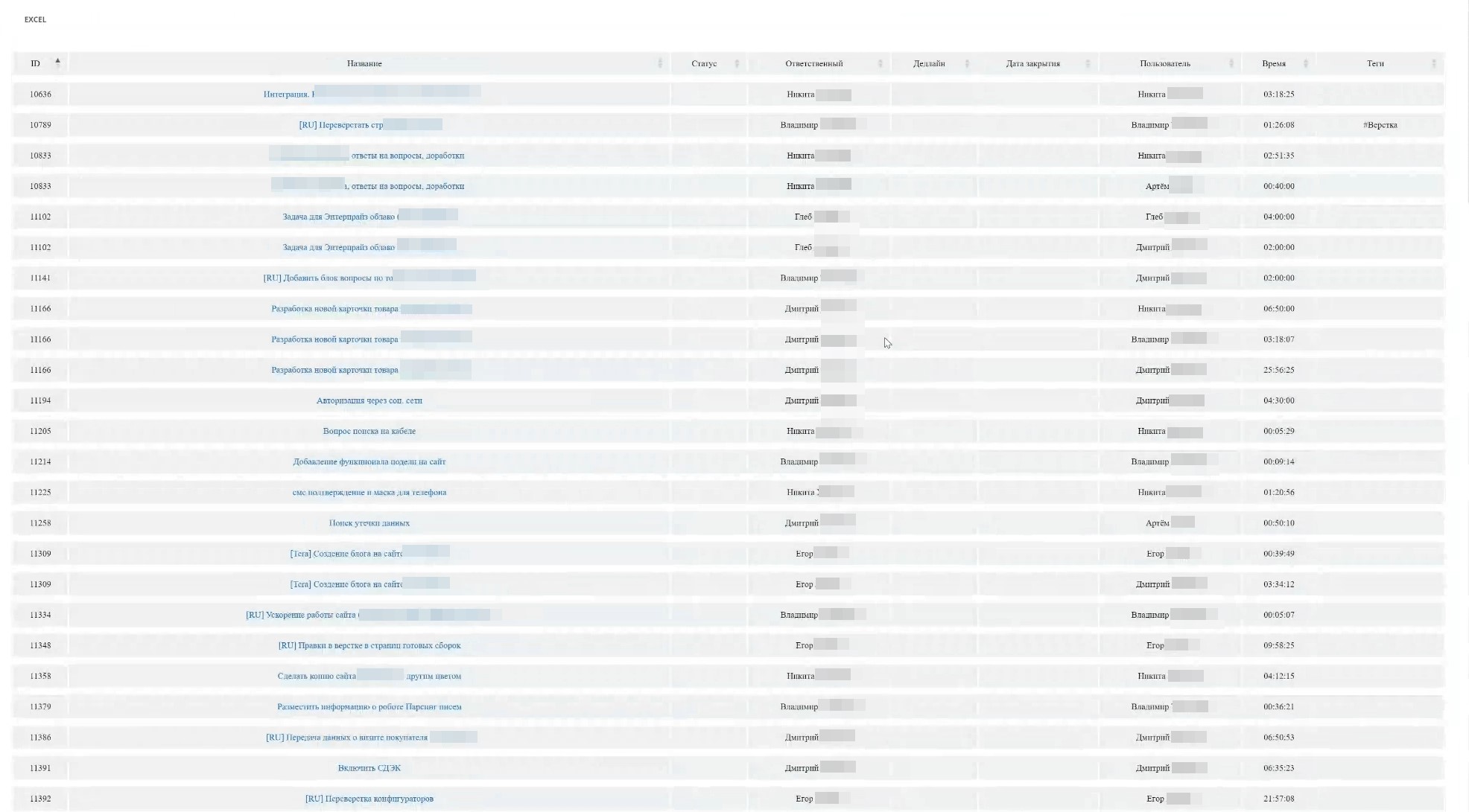 Закрытое время в задачах за период – Получите исчерпывающий список завершенных задач с указанием дат, статусов, затраченного времени и тегов. Это идеальный инструмент для анализа и улучшения рабочих процессов.